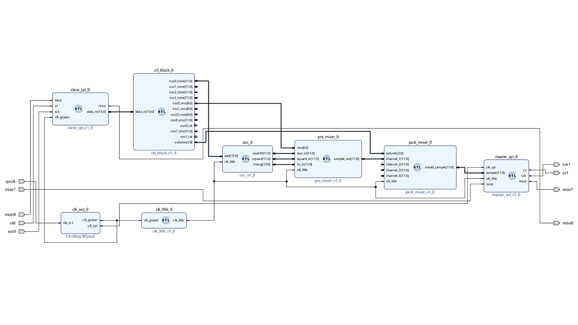 - Two of the voices have gain envelopes, and after these are applied, all four channels are mixed before being output to a 12-bit digital-to-analog converter using an SPI “controller” block