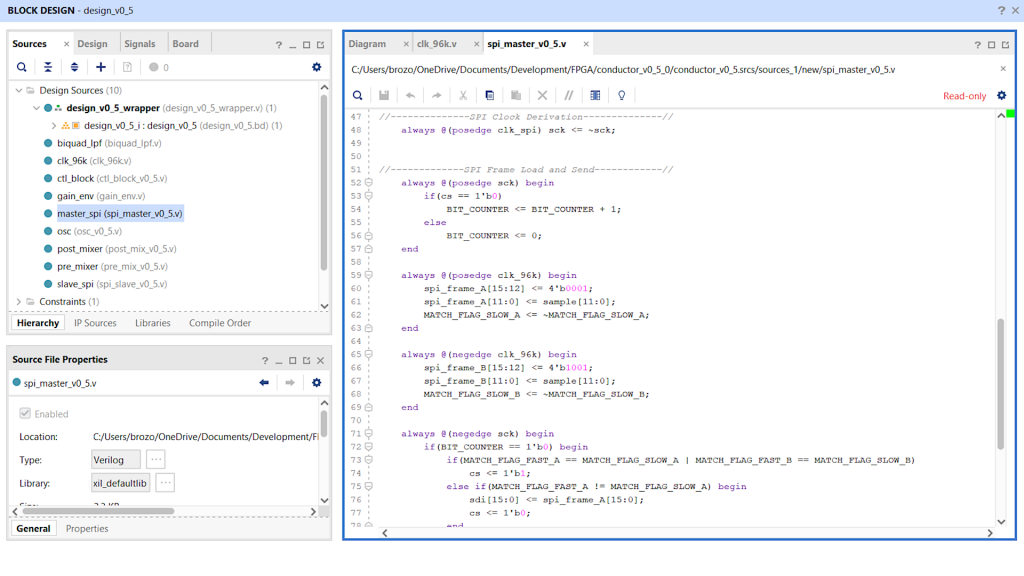 This design represents a large portion of my contribution to my senior design capstone project at the University of Michigan-Dearborn, for which I and three other students designed and built a fully automated electronic music generator driven entirely by environmental sensors: camera, temperature, humidity, and ambient sound. Every portion of the FPGA design save for the Clock Wizard was developed in-house using the Verilog hardware design language, and sensor-derived command signals were generated and transmitted to the FPGA over Serial Peripheral Interface (SPI). Final output from the FPGA is 12-bit, uncompressed stereo audio at 96k samples per second.