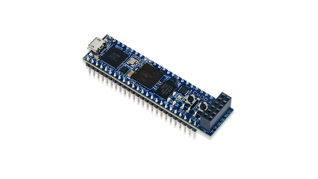 The CMOD A7-35T from Digilent is a small, low-cost FPGA development board perfect for embedded applications thanks to its tiny footprint and 48 header pins, making it ideal for this application. The board’s Xilinx Artix 7 35T chip has 33,280 logic cells in 5200 slices, and a default main clock speed of 100 MHz, giving it more than enough power for real-time audio digital signal processing.